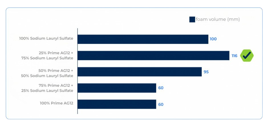 In addition to the results shown in this study, we can adopt intermediate ratios between 25% Prime AG12 and 75% Sodium Lauryl Sulfate or 50%/50%, in order to obtain the ideal balance between all the parameters studied (stability and foam volume, viscosity and cleaning).