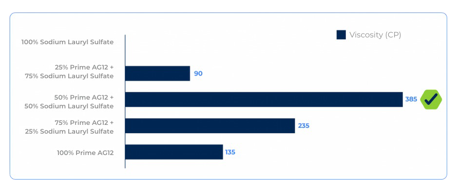 Regarding viscosity, it was observed that Prime AG12 is less soluble than Sodium Lauryl Sulfate, reducing the required salt dosage in the formulation.