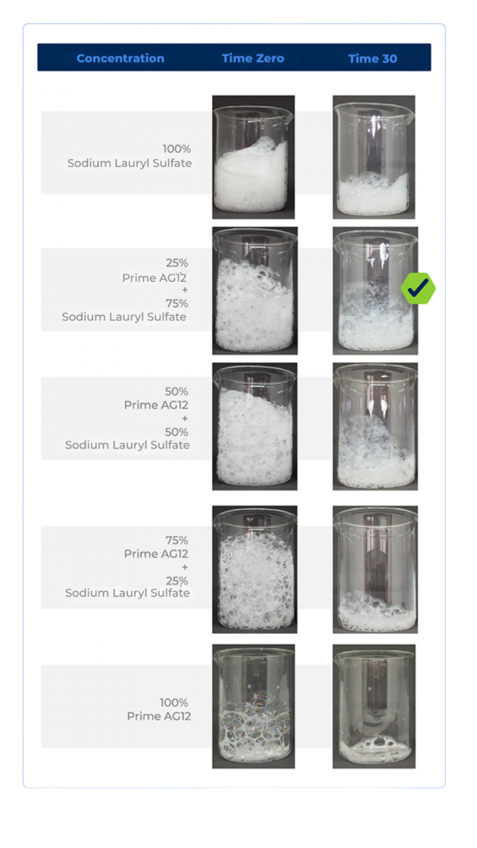 In this case, it is noted that, to achieve foam stability, the best relationship between the two products is 25% Prime AG12 and 75% Sodium Lauryl Sulfate.