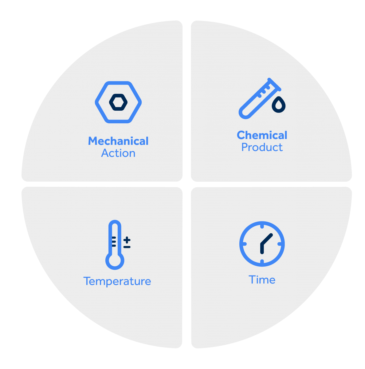 A practical example of where heat is very helpful is in CIP (cleaning in place). The only mechanical action present in this system is the water pressure that circulates internally, which forces us to increase the efficiency of the other points in the Sinner's Circle, compensating for this factor.