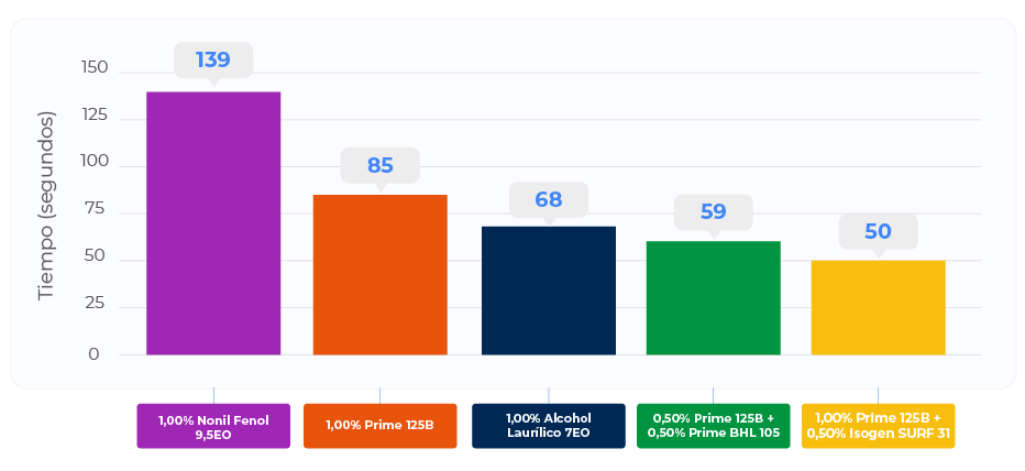 En el gráfico siguiente se puede ver una comparación de la capacidad de humectación según el método Draves Wetting Test, con la sugerencia de combinar Prime BHL 105 o Isogen SURF 31 con Prime 125B para potenciar aún más esta característica.