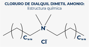 El activo en cuestión en este artículo, el cloruro de dialquildimetilamonio, presenta en su estructura química grupos alquilo con una cadena de carbono compuesta por 16 a 18 carbonos (estearilo), una región catiónica derivada del nitrógeno cargado positivamente y un contraión cloruro, como se muestra en la imagen siguiente: