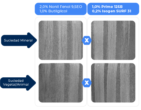 En el caso de los desengrasantes para grasas, cuando se asocia con Prime 125B, se observa una mejora significativa en el rendimiento con una dosis baja de Isogen SURF 31. Esta situación es solo uno de los ejemplos en los que las soluciones de Macler siguen sustituyendo con ventaja al Nonil Fenol 9,5EO, al Alcohol Laurílico 7 EO y al Butilglicol en las formulaciones.