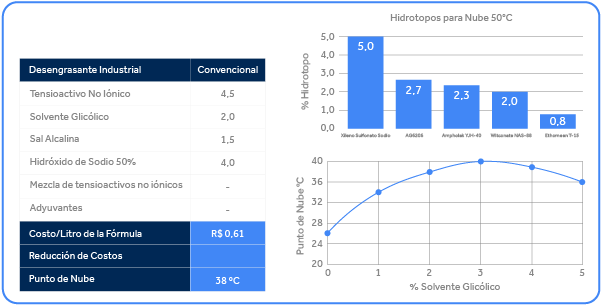 Cabe destacar que cuanto más cerca esté el producto del punto de nube, mayor será su poder de limpieza. Por lo tanto, en formulaciones que contienen álcalis, es necesario prestar atención a la cantidad de butilglicol y electrolitos dosificados, de modo que se alcance un punto de nube de al menos 50°C, que es la temperatura mínima que garantiza el mantenimiento de la integridad del producto durante el almacenamiento y el transporte.