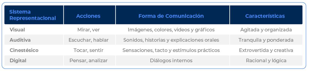 Cada persona se comunica y comprende la información de manera diferente. Comunicarse utilizando el Sistema Representacional Preferente del otro acentúa la identificación y hace que la comunicación sea más asertiva. Entiende más en este artículo e identifica tu Sistema Representacional Preferente.