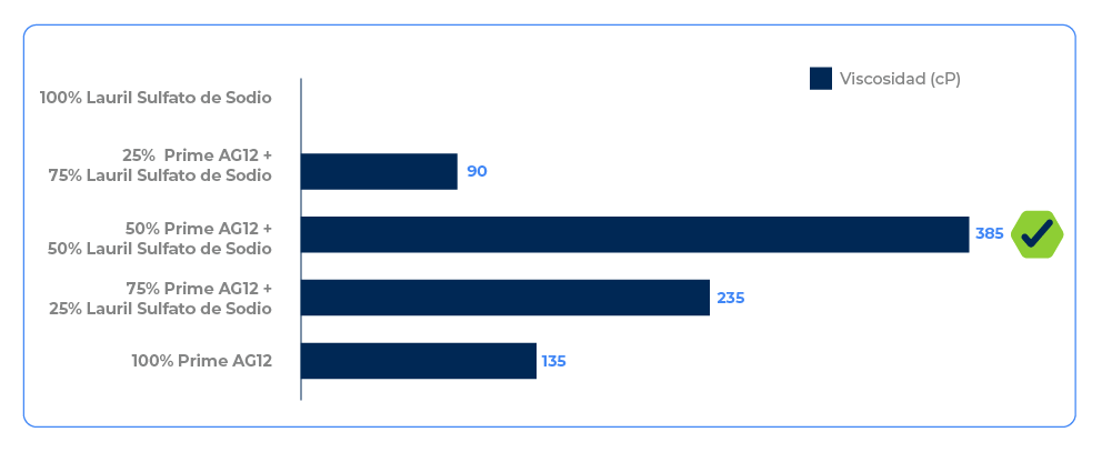 En el gráfico de viscosidad que se muestra a continuación se puede observar la variación del Lauril Sulfato de Sodio y Prime AG12. También se observa que, con la adición de Prime AG12 junto con el Lauril Sulfato de Sodio, se produce un aumento de la viscosidad, siendo la mejor relación de activos 50% Prime AG12 y 50% Lauril Sulfato de Sodio.