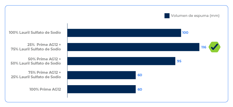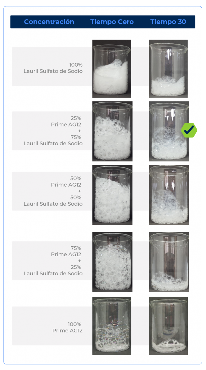 En este caso, se observa que, con el fin de lograr la estabilidad de la espuma, la mejor proporción entre los dos productos es del 25% de Prime AG12 y del 75% de Lauril Sulfato de Sodio.
