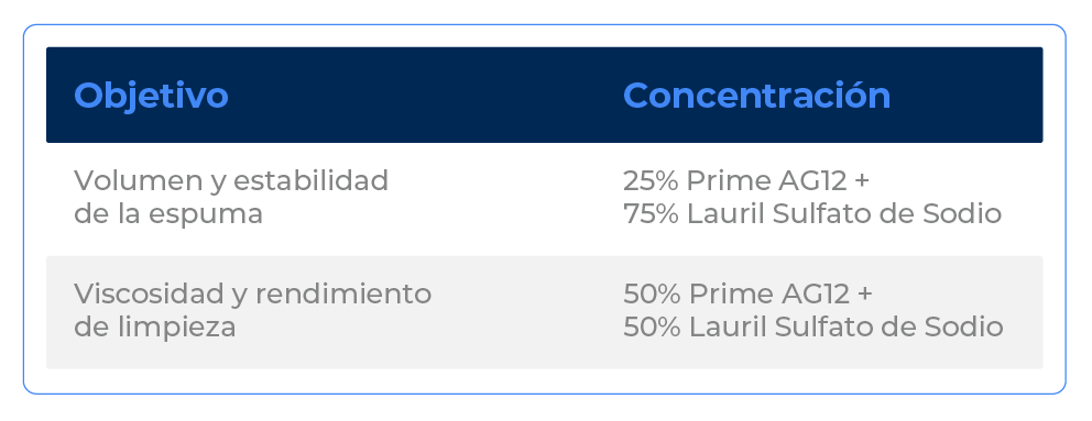 Además de los resultados evidenciados en este estudio, podemos adoptar relaciones intermedias entre 25 % Prime AG12 y 75 % Lauril Sulfato de Sodio o 50%/50%, con el objetivo de obtener el equilibrio ideal entre todos los parámetros estudiados (estabilidad y volumen de espuma, viscosidad y limpieza).