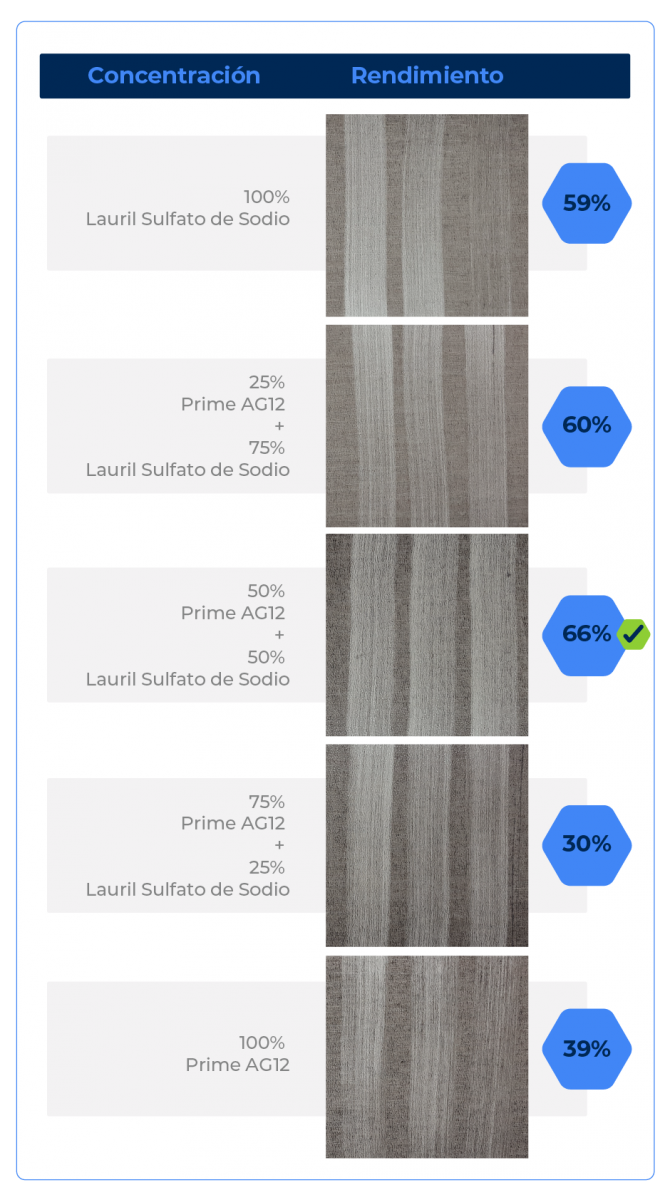 Se observa que la proporción de 25% de Prime AG12 y 75% de lauril sulfato de sodio presenta el mejor rendimiento.