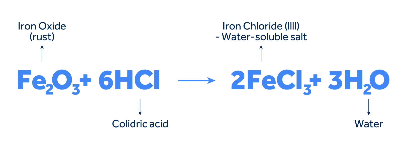 - Dissolution of the oxide: Hydrochloric acid "attacks" the iron oxide layer, breaking chemical bonds and forming iron ions and chloride ions.