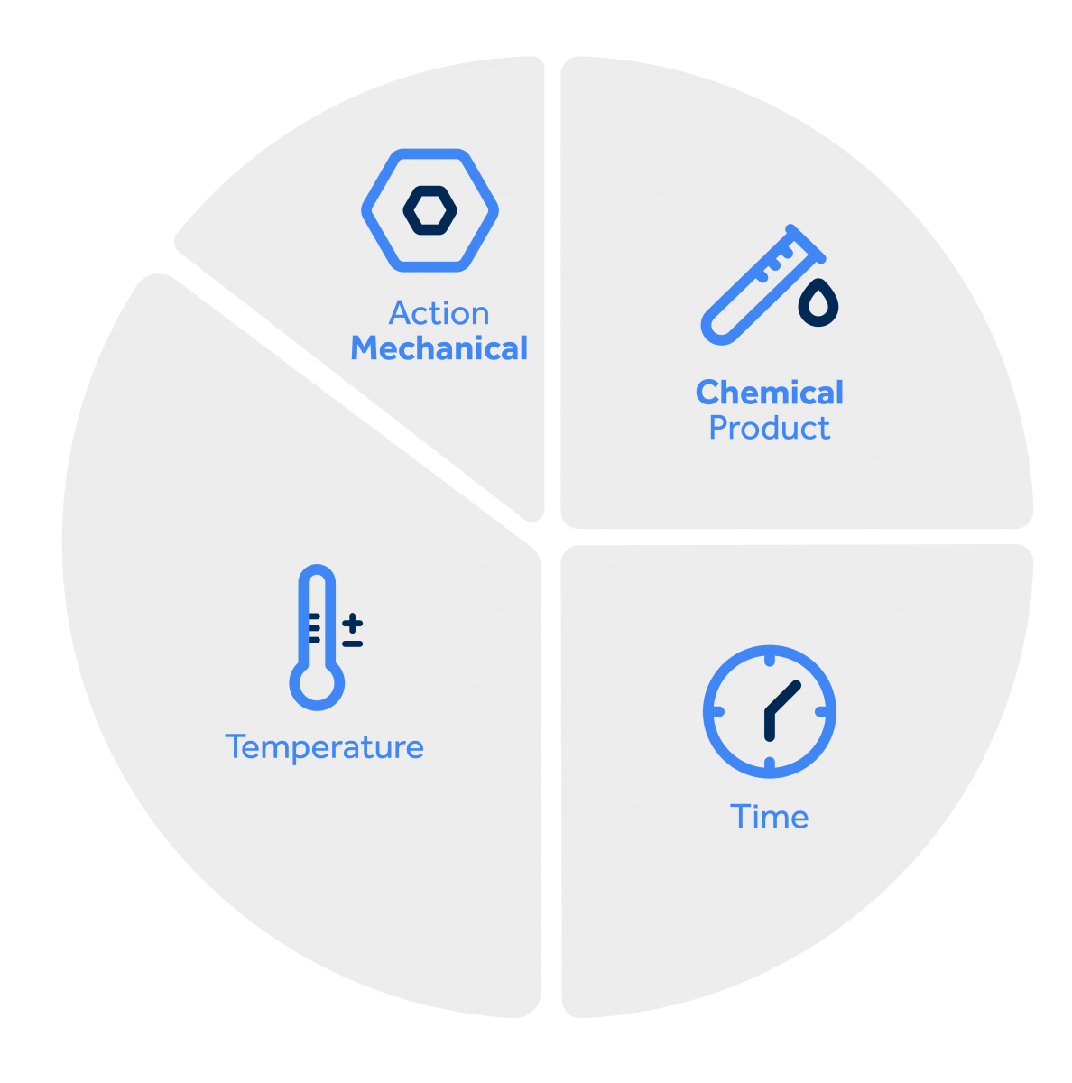 A practical example of where heat is very helpful is in CIP (cleaning in place). The only mechanical action present in this system is the water pressure that circulates internally, which forces us to increase the efficiency of the other points in the Sinner's Circle, compensating for this factor.
