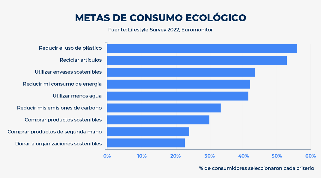 Según la Lifestyle Survey 2022 de Euromonitor, en lo que respecta a la preocupación medioambiental, reducir el uso de plásticos, reciclar y utilizar envases sostenibles se encuentran entre las principales prioridades de los consumidores.