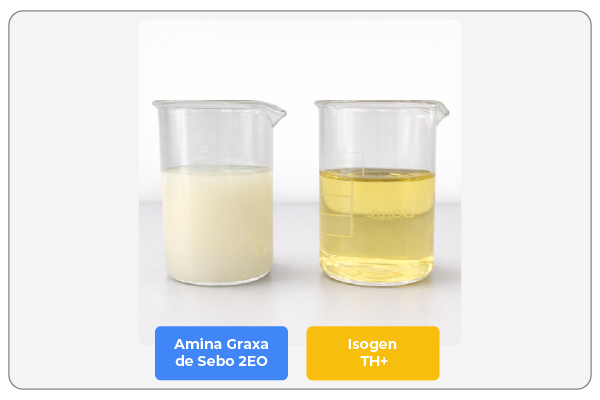 Estudos comparativos demonstram que o Isogen TH+ mantém estabilidade em condições em que a Amina Graxa de Sebo 2EO apresenta turvação, um indicativo claro de instabilidade.